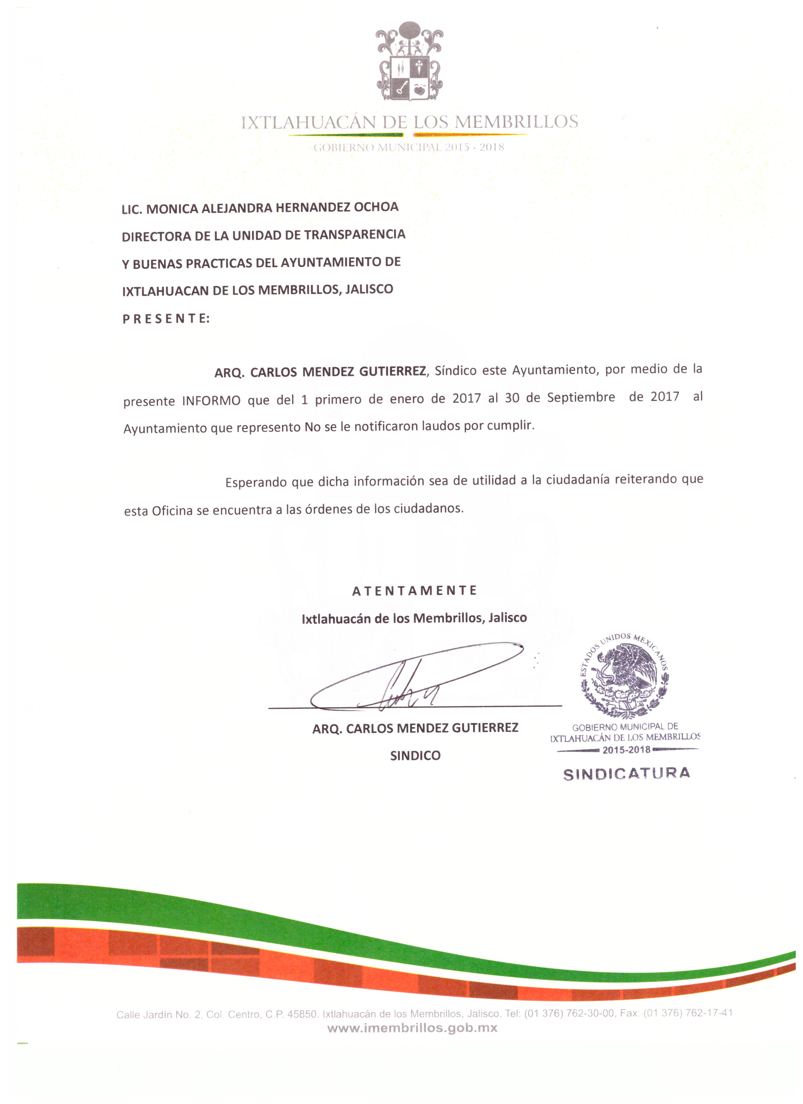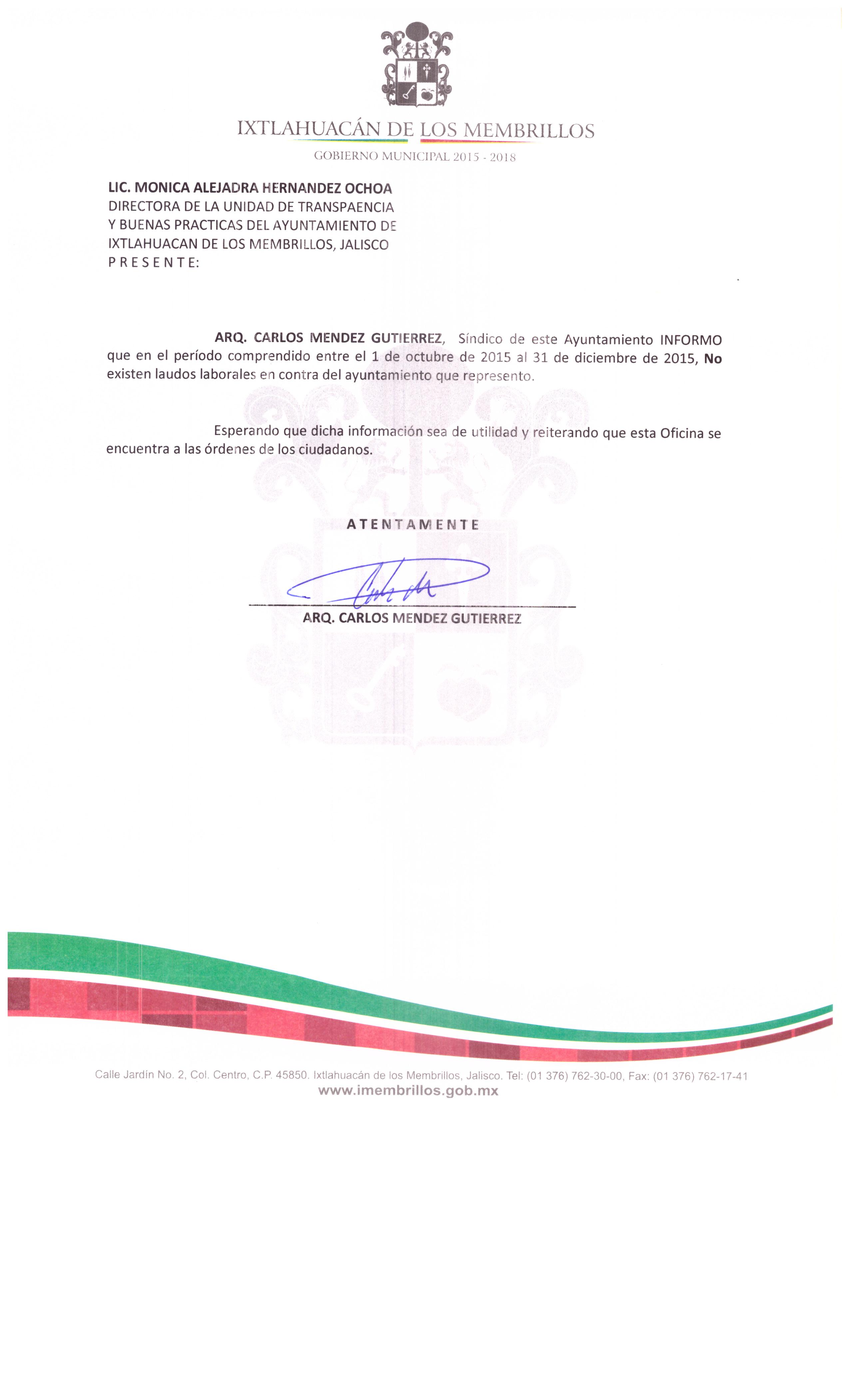 Se informa a la ciudadanía que en los meses de octubre, noviembre y diciembre del año 2018 no se notificaron LAUDOS LABORALES al Ayuntamiento de Ixtlahuacán de los Membrillos Jalisco.